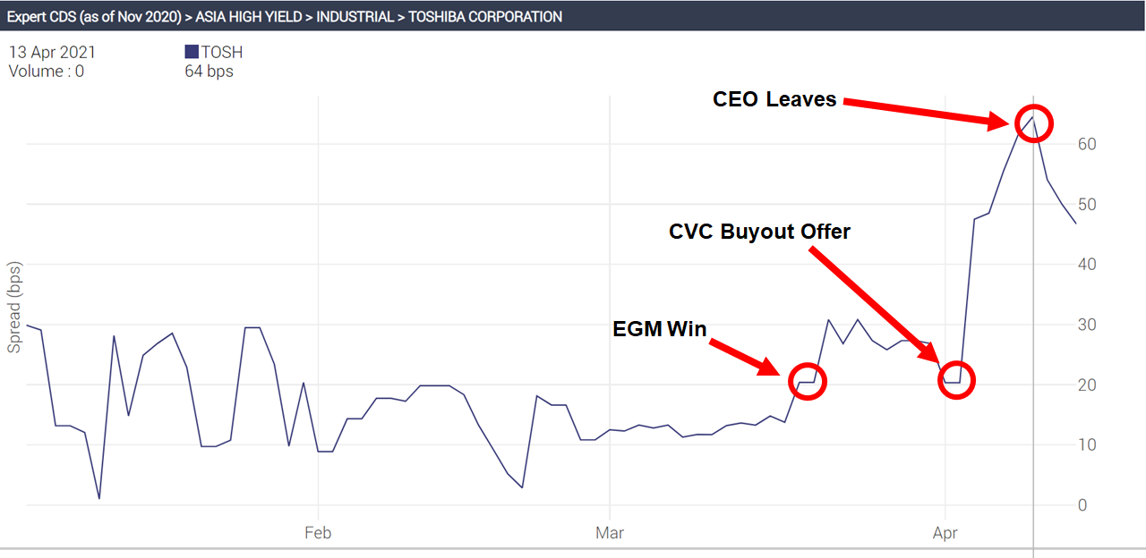 As you can see, after the EGM win, Toshiba’s implied default risk shot up 50%, before then coming back down to previous prices, before then rocketing 200% after the prospect of a $20bn LBO came into investor’s minds. Interestingly, its come down after the CEO left, perhaps adding weight to the idea that CVC’s approach was the most likely to actually complete, and any others wouldn’t be feasible.